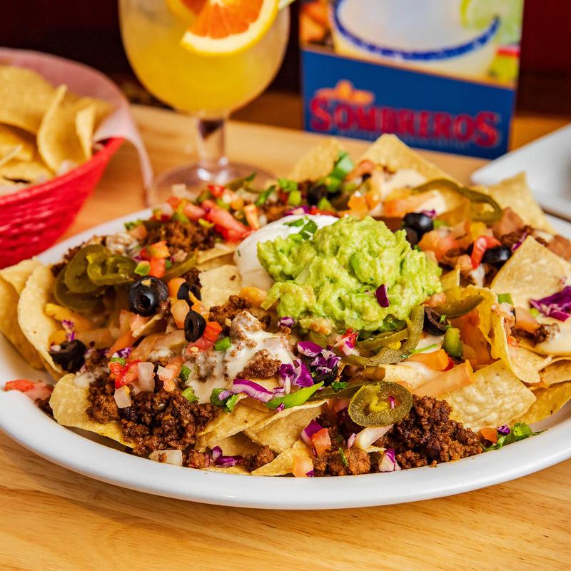Crisp flour tortillas open face, spread with beans, seasoned beef topped with lettuce, tomatoes, jalapeños, cheese, guacamole, sour cream & black olives, served with chili con queso chips.